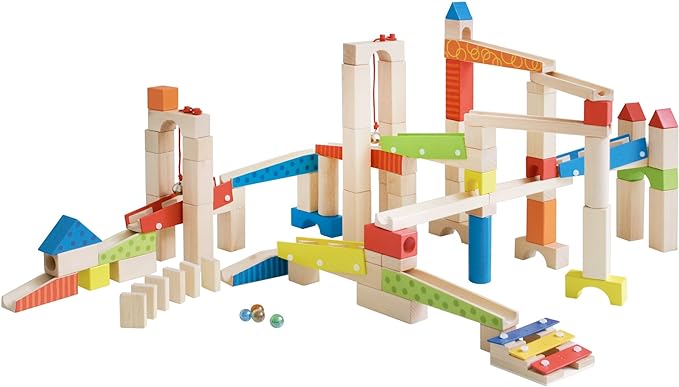 El Roba Ball es un circuito de canicas que incluye 20 canicas de vidrio y 80 bloques de construcción de madera coloreados, impresos y con acabado natural. Estas piezas son fáciles de combinar, lo que permite a los niños dar rienda suelta a su creatividad y desarrollar habilidades como la paciencia, la concentración y la motricidad.