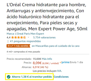 Para poder realizar la compra de esta crema revitalizante por el precio de 6,71€ hay que asegurarse de tener marcada la opción ‘Ahorra 1,38 € al tramitar pedido’, de tal forma a la hora de tramitar el pedido el descuento total será un 55%: