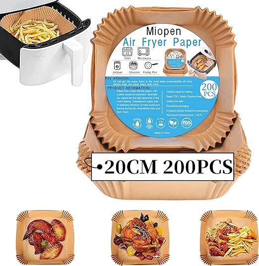 Cada papel de freidora tiene forma cuadrada, con un diámetro inferior de 20 cm y una altura de borde de 4,5 cm para evitar que el aceite se filtre en las freidoras. Estos revestimientos se ajustan a freidoras de aire de 5L a 8L.