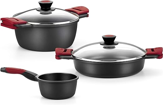 Si estás buscando una batería de cocina de gran calidad, no busques más. Te presentamos la BRA Premiere de 3 Piezas Aluminio Fundido Antiadherente, apta para todo tipo de Cocinas e Inducción. Esta batería de cocina está fabricada en aluminio fundido de alta resistencia, con un espesor de 5,5mm en la base, lo que la hace muy resistente a la deformación. Además, cuenta con un fondo difusor uniforme de eficiencia, que te permitirá ahorrar energía al cocinar.