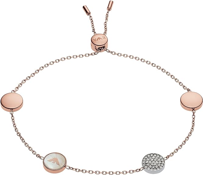 Si estás buscando un chollo en joyas, no puedes dejar pasar la oportunidad de hacerte con la pulsera Emporio Armani. Esta pieza única es perfecta para lucirla junto a otros complementos o como pieza única. Presenta colgantes de metal pulido en tono oro rosa, de nácar con el logotipo y con cristales. Con un tamaño de 16 cm, esta pulsera de acero inoxidable es el complemento ideal para cualquier ocasión. Y lo mejor de todo es que puedes comprarla en Amazon por solo 45,15€.