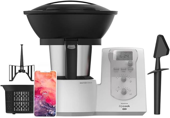 Con el Taurus Mycook One, cocinar será pan comido. Podrás seguir fácilmente las recetas en tan solo 4 pasos: pesar los ingredientes en su báscula integrada, seleccionar el tiempo, ajustar la temperatura y regular la velocidad. Además, cuenta con una vaporera de dos niveles, jarra, cestillo colador y muchos otros accesorios que te facilitarán la tarea en la cocina.